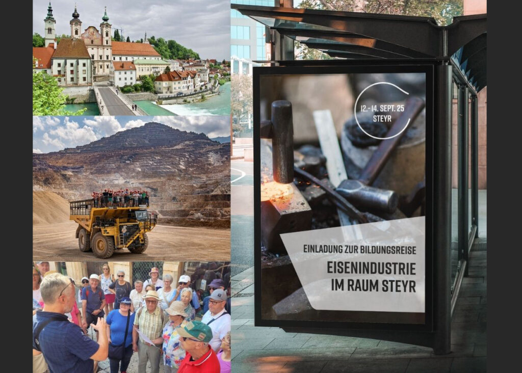 Vom 12. bis 14. September 2025 findet unsere Bildungsreise zum Thema Eisenindustrie nach Steyr statt. Auf dem Programm steht eine Fahrt mit einem Hauly durch den Erzberg, eine Nachtwächterführung durch die Altstadt von Steyr, der Besuch des Arbeitsmuseums und vieles mehr.