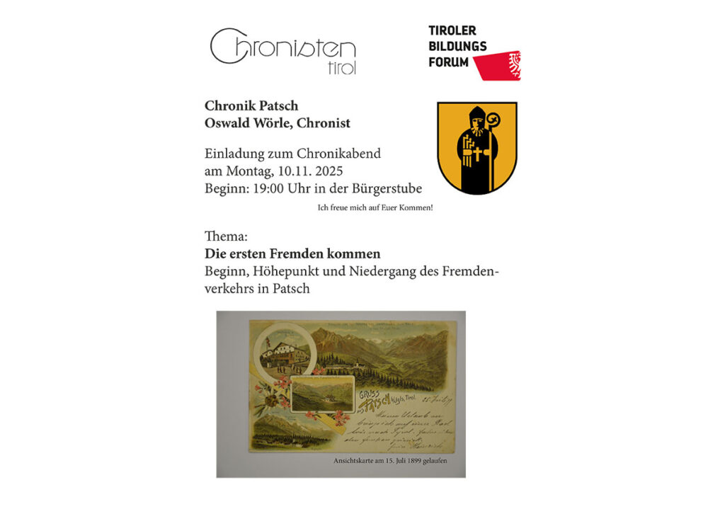 Der Chronist Oswald Wörle lädt am Montag, den 10. November 2025, um 19:00 Uhr in die Bürgerstube Patsch zum traditionellen Chronikabend ein.