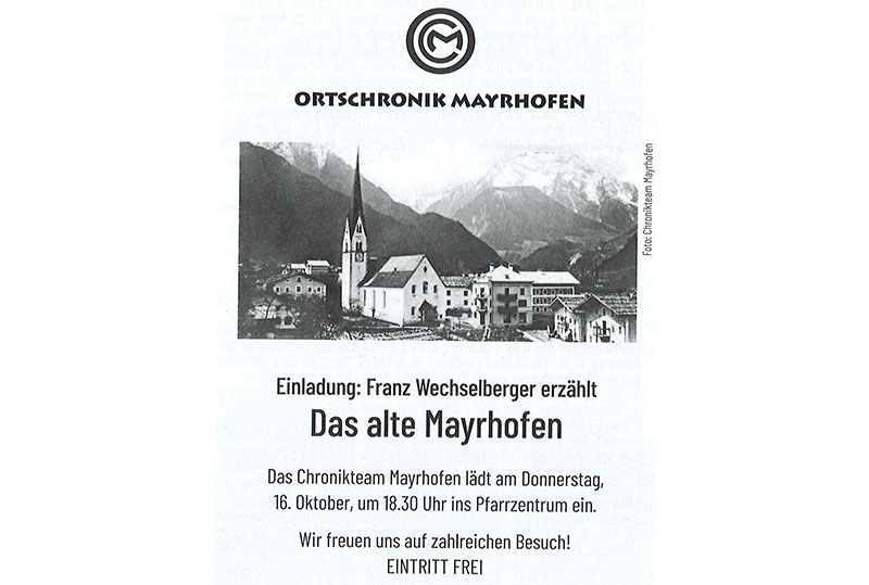 Das Chronikteam Mayrhofen lädt herzlich ein und freut sich auf zahlreichen Besuch!