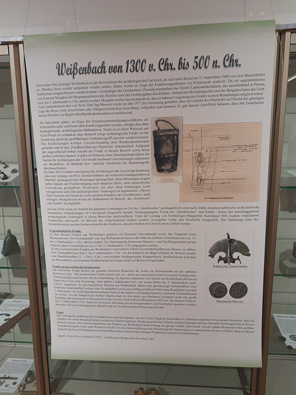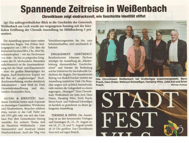 Am vergangenen Sonntag wurde im Mühlbachweg 5 die neue Chronik-Ausstellung der Gemeinde Weißenbach am Lech eröffnet. Die Präsentation nimmt die Besucherinnen und Besucher mit auf eine eindrucksvolle Zeitreise – von den frühesten Siedlungsspuren um 1300 v. Chr. über die Römerzeit und historische Naturkatastrophen bis hin zu prägenden Ereignissen des 20. Jahrhunderts.
