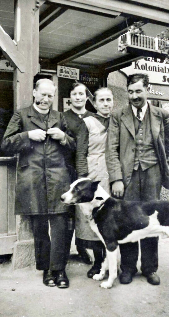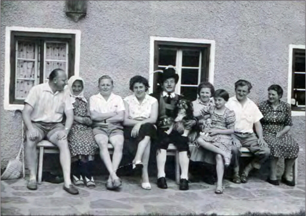 Er gehörte zu den ältesten Haiminger Opfern des 2. Weltkrieges: David Hofmann, geboren am 4. Dezember 1903, starb am Herz-Jesu-Sonntag des Jahres 1945 auf einem Gefangenentransport nach Russland. Nach einem Bericht eines Mitgefangenen, der 1947 aus russischer Gefangenschaft heimkam, ist der Familienvater in einem Gefangenenlager in Tabor (Südböhmen) verstorben. Im Lager waren 15.000 Soldaten interniert, täglich gab es ½ Liter dünne Wassersuppe und eine Scheibe Brot. David Hofmann kam in Gsies im Pustertal als Sohn der Bauersleute Silvester Hofmann und Agnes (geb. Hintner) auf die Welt. Er arbeitete als Tischler und heiratete am 10.11.1931 in Absam Anna Valte aus Haiming. Das Ehepaar Hofmann hatte vier gemeinsame Kinder (Marianne, die Älteste, brachte Anna in die Ehe mit). Auf dem Foto ist die Familie kurz vor der Einberufung des Vaters versammelt zu sehen.
