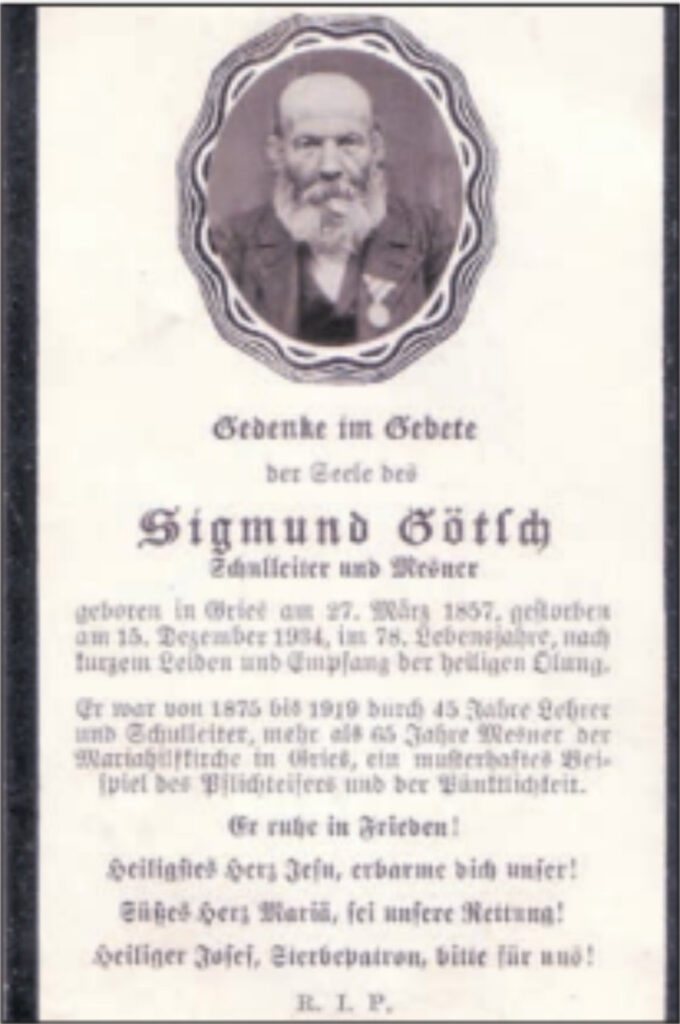 Am 17.12.1934 wurde auf dem neu errichteten Friedhof in Gries im Sulztal als Erster Sigmund Götsch zur geweihten Erde bestattet. Götsch war von 1875 bis 1919 Schulleiter und Lehrer in Gries sowie mehr als 65 Jahre Mesner der Kaplanei- und Wallfahrtskirche in Gries. Seine Sehnsucht wäre es gewesen, Priester zu werden. Er lernte aus eigenem Interesse die lateinische Sprache, fand jedoch niemanden, der ihm zum Studium verholfen hätte. Sigmund Götsch wurde als 4. Kind des Donat Götsch und der Maria Falkner von Gries geboren. Unter seinen Vorfahren finden wir den Schreiner Cassian Götsch (1657) und den weit über die Grenzen hinaus bekannten Bildhauer Josef Götsch (1728), die etliche Kirchen des Ötztales mit Altären ausgestattet haben.