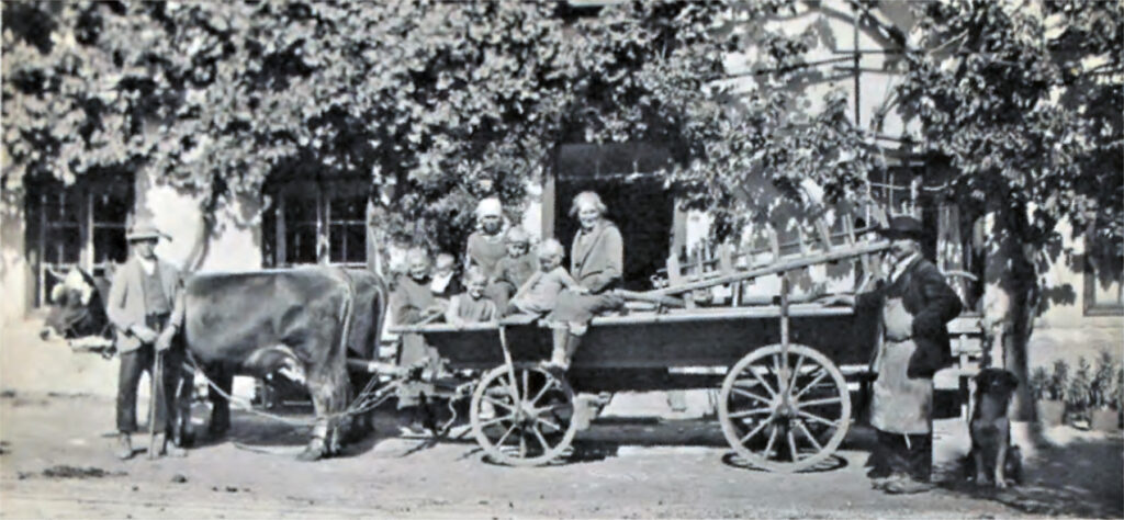 Mittelpunkt des gesellschaftlichen Lebens in Magerbach, dem Ortsteil der Gemeinde Haiming nördlich der Innbrücke, war seit jeher der Gasthof Löwen. Da bis Ende der 1930er Jahre über Magerbach die Reichsstraße vorbeiführte, gab es dort auch für die anwohnenden Kinder allerhand zu bestaunen. Fremde Gestalten, knatternde Automobile und illustre Gäste sorgten für Unterhaltung rund um das Gasthaus, das damals im Eigentum von Eduard Leitner „Zedler“ stand. Und in den umliegenden Bauernhöfen fanden sich genügend Gleichaltrige, mit denen man herumtoben konnte. Das Foto zeigt einige der Magerbacher Kinder in ihrem Sonntagsgewand auf der Bank vor dem Gasthaus Löwen.