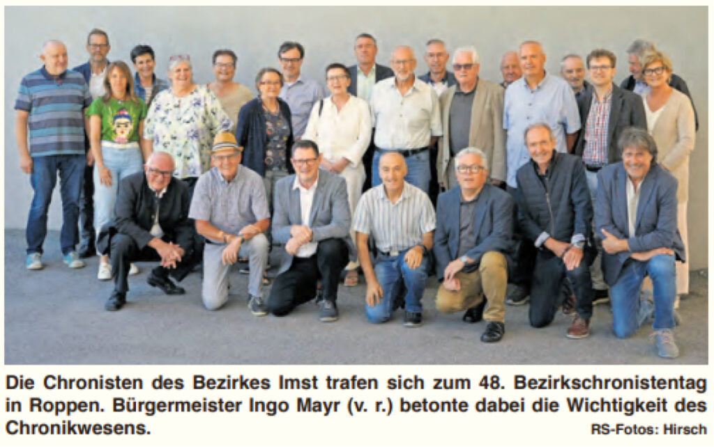 Der Chronistenbezirk Imst umfasst alle 24 politischen Gemeinden des Bezirkes Imst. Alljährlich treffen sich die Hüter des Wissens beim Bezirkschronistentag, um sich auszutauschen, sich zu vernetzen und über ihre laufenden Projekte zu berichten. Dieses Jahr lud das ChronistenTeam Roppen in den Kultursaal der Gemeinde. Bürgermeister Ingo Mayr betonte dabei die Wichtigkeit des Chronikwesens für die Gemeinden.