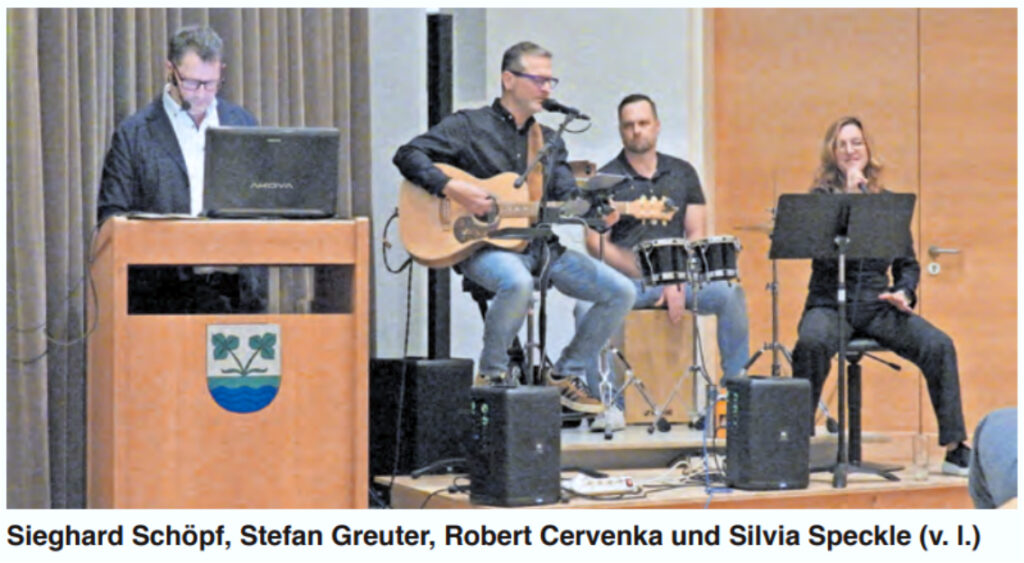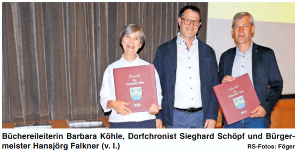 Mit dem Lied „Heast as net“ von Hubert von Goisern wurden die Besucher im voll besetzten Saal Ez am Freitagabend, 19. September, auf einen ganz besonderen Abend eingestimmt. Hatten doch Dorfchronist Sieghard Schöpf und das Team der Bücherei im Turm zur Vorstellung der Dorfchronik des Jahres 2023 geladen. Einen herzlichen Gruß richtete er an alle, die gekommen sind – an Alt und Jung, an die drei Musiker Silvia Speckle, Robert Cervenka und Stefan Greuter, einen besonderen aber an Bürgermeister Hansjörg Falkner, Vizebürgermeister Michael Nagele, Altbürgermeister und Ehrenbürger Joachim (Jochl) Grießer, Gemeinderäte, Chronistenkollegen u. a. Ein großes „Danke“ richtete Sieghard an den Bürgermeister, das Büchereiteam und an alle, die ihm immer wieder wichtige Informationen und Fotos zukommen lassen. Nach dem Dank für die immer wieder positiven Rückmeldungen bzgl. seiner Arbeit wies er auf die Hochzeitsfotos, die er ausgestellt hatte, hin und dazu stand geschrieben: „Es ist ein großes Geschenk, einen Menschen zu treffen, mit dem man über so lange Zeit glücklich zusammen ist.“ Nach der Chronikübergabe an den Bürgermeister und an die Büchereileiterin Barbara Köhle ergriff Bürgermeister Hansjörg Falkner das Wort. Er zeigte große Freude über die Arbeit von Sieghard, dankte ihm dafür, dass er bei allen Veranstaltungen dabei ist, zeigte große Wertschätzung ihm gegenüber und ist froh, „dass wir ihn haben“. Ebenso dankte er dem Büchereiteam und mit der Überreichung eines Blumenstraußes an die Gattin von Sieghard und Büchereileiterin Barbara schloss er seine Grußworte.