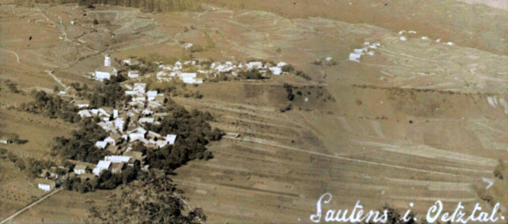 Als Feldpostkarte wurde diese Ansicht von Sautens am 9.2.1917 versendet. Absender waren Toni und Marianne, die ihrem Cousin Josef Strigl tausend herzliche Grüße wünschten. Interessant ist der weitere Text auf der Hinterseite der Karte. Dort berichten Toni und Marianne nicht nur, dass in Sautens alles gesund sei, sondern auch von drei Diebstählen, die eine gewisse „Rinka“ beim „Hart“, beim „Jageles“ und beim „Lorenzen Daniel“ getätigt haben soll. Dabei soll die Diebin 280 Kronen, dann 100 Kronen und schließlich noch 38 Kronen erbeutet haben (die Gesamtbeute von 418 Kronen entspricht heute einer Kaufkraft von ca. 442 Euro). Beim letzten Diebstahl habe man sie erwischt, schreiben die beiden. Abschließend berichten sie ihrem Cousin Josef, dass die Leute abends die Türen fleißiger sperren, und wünschen ihrem Verwandten viel Gesundheit und frohen Mut.