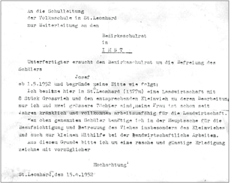 Was heute schwer vorstellbar ist, gehörte früher in bäuerlich geprägten Regionen als selbstverständlich dazu. So auch im Pitztal, wo die Bauersleute auf die Mitarbeit ihrer Kinder angewiesen waren. In der Schulchronik von St. Leonhard lagern viele Dokumente, die die Notwendigkeit der Mithilfe der Kinder in Haus und Hof belegen. Die Ansuchen an den Bezirksschulrat betrafen vor allem das Hüten von Vieh, dazu wurden die Kinder schon Ende April gebraucht und aus der Schule genommen. Nicht immer mit Erlaubnis, deswegen wurden die Eltern wegen des „Schulschwänzens“ ihrer Kinder bestraft. Im abgebildeten Schreiben vom 15.4.1952 sucht ein Familienvater aus St. Leonhard um Befreiung seines Sohnes Josef an – schließlich wurde ihm die Erlaubnis erteilt, seinen Sohn ab 1. Mai aus der Schule zu nehmen. Das Foto zeigt das alte Volksschulgebäude, das bis 1973 in Verwendung war.