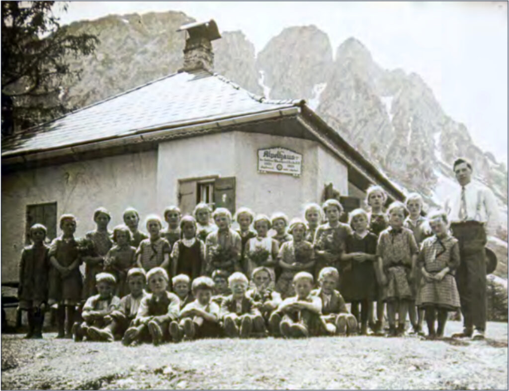Dem „fotografierenden“ emeritierten Priester Franz Xaver Klotz (1868–1942) verdanken wir diese Aufnahme des „Alplhauses“, die eine Schulklasse mit Lehrer zeigt. Entstanden dürfte das Foto in den späten 1920er-Jahren sein.