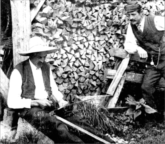 Unser Bild zeigt Alois Götsch „Unterruaner“ beim Dengeln der Sense – er wird dabei interessiert von seinem Sohn Franz Josef beobachtet. Die Familie Andreas (†12.7.1799) und Maria Götsch, geb. Praxmarer, wohnte ursprünglich im Hof zu „Unterrain“ im Ortsteil Schlierenzau. Josef Karl Götsch (1817–1872) übersiedelte 1864 nach Haiming in die heutige Kreuzstraße, und dessen Sohn Alois (1846–1922) verehelichte sich mit der Magerbacher Wirtstochter Maria Filomena Kapeller. Alois war viele Jahre Vorstand des Veteranenvereines. Auch die nachfolgenden Generationen betätigten sich in unterschiedlichen öffentlichen Funktionen der Gemeinde Haiming. So war Franz Josef Götsch (1880–1965) Aufsichtsrat der örtlichen Raiffeisenkasse und Gemeinderat, dessen Sohn Franz (1919–2000) Bauernbundobmann, Waldaufseher und kurzzeitig Bürgermeister sowie Ehrenbürger.