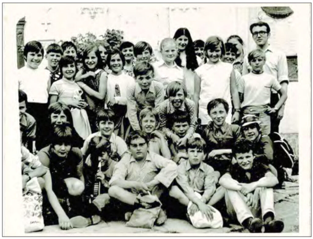 Ausflüge und Wandertage stellten im Schuljahr besondere Höhepunkte dar. Nicht alle Eltern waren vor fünfzig, sechzig Jahren im Besitz eines Autos, so fanden einige jede Fahrt an einen noch unbekannten Ort spannend. Außerdem konnte man den Schulalltag für ein paar Stunden vergessen. Die schmal gefüllte Geldbörse reichte vollkommen aus, die Wanderlustigen hatten ja einen Rucksack mit etwas Speck, Käse und Obst dabei. Und für den Zusammenhalt in der Klasse waren diese Schulveranstaltungen besonders wertvoll. Im Bild sehen wir die 2b-Klasse des Bundesrealgymnasiums Imst mit ihrem Klassenvorstand Mag. Josef Lobmayr beim Wandertag 1971 vor der Pfarrkirche Oetz.