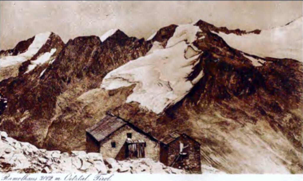 Diese Kupferdruckkarte vom Ramolhaus wurde in den 1920er-Jahren von der Kupferdruck Monopol Verlagsanstalt mit Hauptsitz in München verlegt. Das Ramolhaus thront auf 3.006 m oberhalb von Obergurgl und ist von dort aus in knapp vier Stunden Fußmarsch zu erreichen. Erbaut wurde die Schutzhütte im Jahr 1881 von Martin Scheiber, dem Urgroßvater des heutigen Pächters Lukas Scheiber. In einem Feuilleton des Mährischen Tagblattes schreibt Johann Weiser über eine Tour auf die Wildspitze im September 1888: „Nach einer unter dem geistlichen Dache des Kuraten Ingenuin Gärber (er war als Vertrauensmann für den Alpenverein tätig) verbrachten Nacht waren wir um 4 Uhr morgens mit dem Führer Alois Santer nach dem Ramoljoche aufgebrochen. Nach dreistündiger Wanderung auf gutem, zuletzt jedoch steilem Steige war das auf dem sogenannten Kreuzköpfel erbaute Ramolhaus erreicht. Nach weiteren, kaum einstündigen Steigen über den Ramolgletscher standen wir auf dem felstrümmerbedeckten Joche in der bedeutenden Höhe von 3182 m.“ Das Ramolhaus steht im Eigentum des Deutschen Alpenvereins, Sektion Hamburg und Niederelbe, und bietet als klassische Schutzhütte 52 Personen Platz. Sie gilt als perfekter Ausgangspunkt für Hochtouren und Wanderungen.