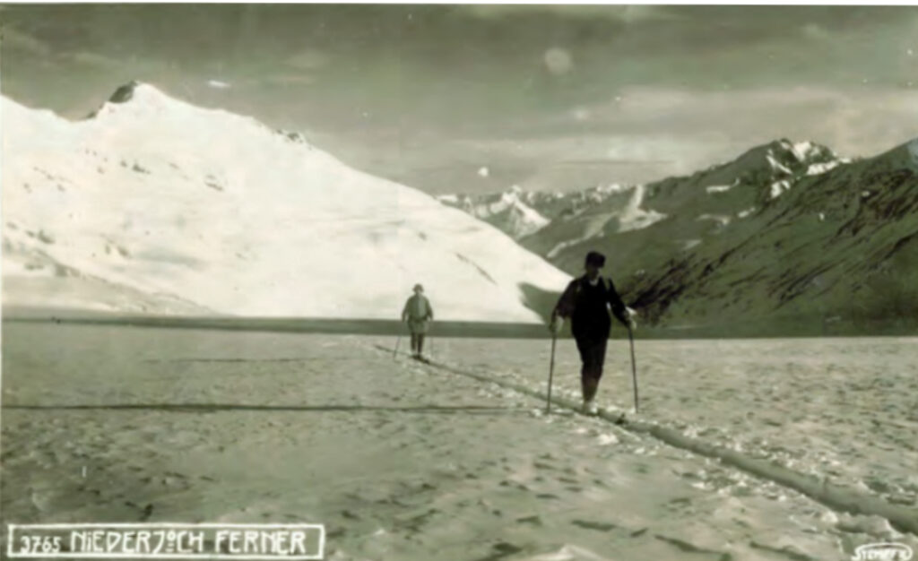 Dass auch der Niederjochferner den klimatischen Veränderungen Tribut zollen muss, beweist diese Ansichtskarte, wenn man sie mit heutigen Aufnahmen vergleicht. Sie wurde von Alois Stigger „Zementeler“ (1900–1980) an seine Eltern Gertraud, geb. Grießer, und Siegfried (1869–1935) Mitte der 1920er Jahre von der Similaunhütte geschickt. Siegfried Stigger betrieb um die Jahrhundertwende eine Zementerzeugung in Haiming. Manch ein älteres Gebäude ist noch heute mit Dachziegeln vom „Zementeler“ gedeckt. Der Niederjochferner erstreckt sich vom Similaun aus in nordwestliche Richtung. Die Gletscherzunge ist in den vergangenen Jahren stark zurückgegangen. Dank seiner leichten Erreichbarkeit, der relativ kurzen Anstiege und technisch geringen Anforderungen ist der Similaun als Gletschertour besonders bei Einsteigern beliebt.