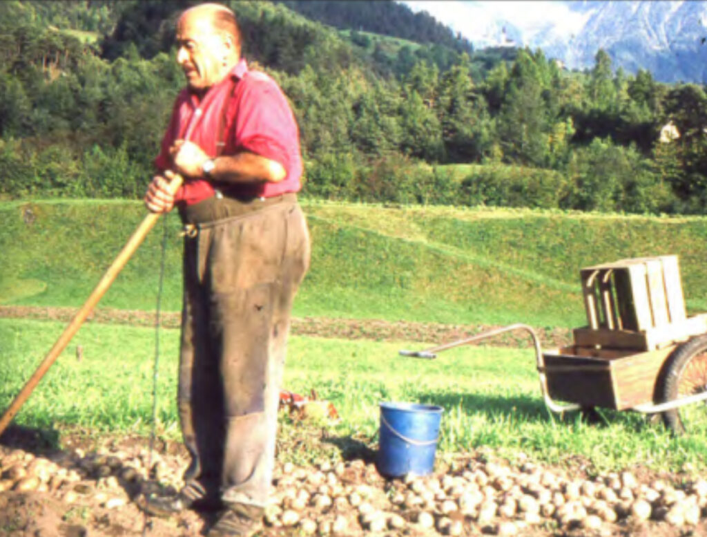 Selbstversorgung aus dem eigenen Garten stand bei der Bevölkerung noch viele Jahre nach dem Ende des 2. Weltkrieges hoch im Kurs. Jeder Quadratmeter Boden wurde genutzt, um Erdäpfel, Karotten, Tomaten usw. anzubauen. So wurde das meist magere Haushaltsetat entlastet und es kamen saisonale Kostbarkeiten auf den Tisch. Im Bild sehen wir Anton Plankl, der im Hausgarten in Brunau mit der Kartoffelernte beschäftigt ist. Er wurde am 5.6.1904 in Müllegg / Salzburg geboren und verehelichte sich mit Marianne Neurauter aus der Brunau. Plankl frönte im Ruhestand seinem großen Hobby, der Fotografie und Filmerei. Selten war er ohne Kamera anzutreffen. Vor allem von den Ausflügen und Zusammenkünften des Pensionistenverbandes hinterließ er viele fotografische Erinnerungen. Anton Plankl starb am 11.10.1992 im Altersheim Sölden und wurde am Friedhof in Ötztal Bahnhof zur letzten Ruhe gebettet.