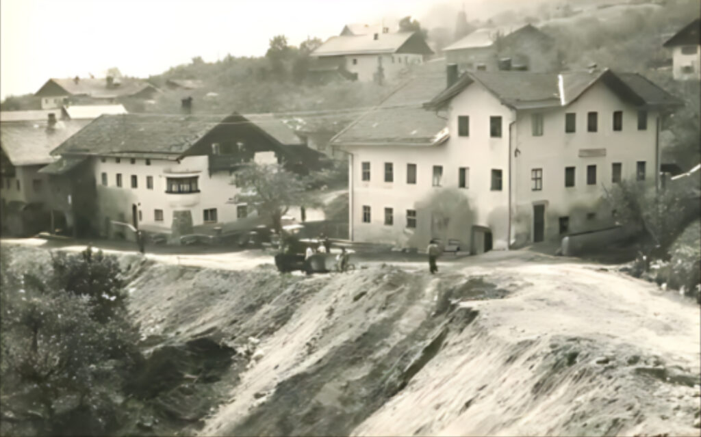 Wie in vielen anderen Gemeinden standen in den Nachkriegsjahren auch in Sautens viele Investitionen in die Infrastruktur auf der Agenda. Mit Mitteln aus dem Marshall Plan (ERP – European Recovery Program) und eigenen Arbeitsleistungen wurden Schulen gebaut, Straßennetze erweitert und die Wasserversorgung modernisiert. Im Bild sehen wir die Baumaßnahme zur Entschärfung des „Roans“, des ehemaligen steilen Anstiegs zwischen Unterrain und Vorderrain. Vorne rechts ist die Sautner Volksschule erkennbar (heute steht dort das Gemeindehaus), ehemals das „Stamser Widum“ zur neuen Kirche. Links davon ist das „Bader“-Haus erkennbar – hier residierte der Wundarzt aus der Familie Oberhofer, die mit Hugo Oberhofer sen. und jun. zwei Bürgermeister stellte. Oberhalb dieser zwei Häuser thront das Anwesen des Anton Pohl „Joselas“ (später „Sautner Hof “). Ganz rechts im Bild die Haushälfte der Familie Franz Strigl („Färbers“). Vor dieser Straßenbaumaßnahme wurde bereits die neue Straßenbrücke über die Ache und die Zufahrtsstraße (1954) in das Dorf errichtet. Die Tiroler Nachrichten berichteten am 23. Juni 1955: „Die neue Brücke über die Ötzer Ache und die herrliche Zufahrtsstraße nach Sautens locken bereits viele Besucher in das idyllische Bergdörfchen und zum Piburger See. Die Straße trägt bis in die Dorfmitte ihren festen Asphaltbelag und in wenigen Tagen wird auch das Brückengeländer und die moderne Wegbeleuchtung fertig sein. Das kleine Bergdorf mit seinen 800 Einwohnern hat übrigens rund 60 Motorräder und 20 Autos.“