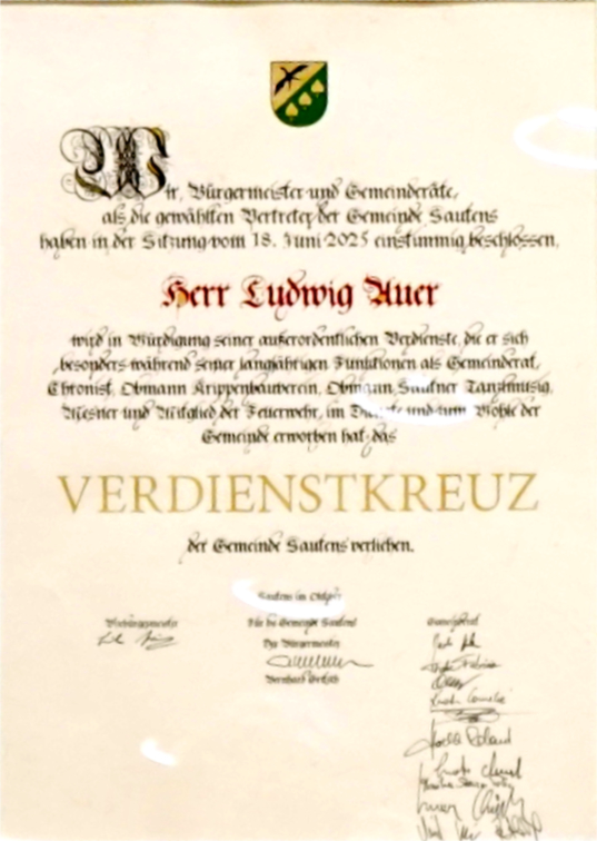 Umrahmt von den Klängen der Sautner Tanzlmusig, feierten Familie, Freunde, Weggefährten und Vertreter der Gemeinde die ehrenvolle Auszeichnung. Sichtlich bewegt nahm Ludwig Auer das Verdienstkreuz entgegen – als Dank für ein Lebenswerk, das Sautens Geschichte und Gemeinschaft nachhaltig geprägt hat.